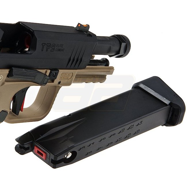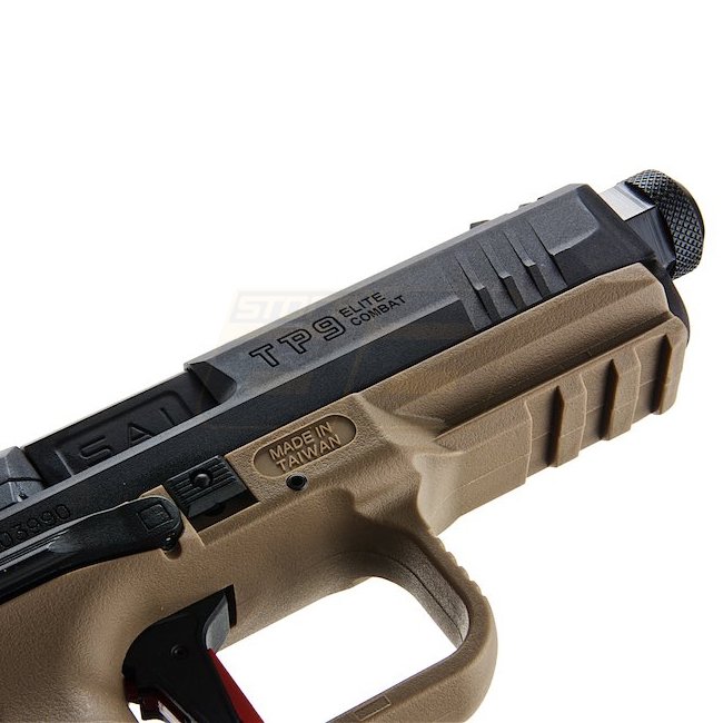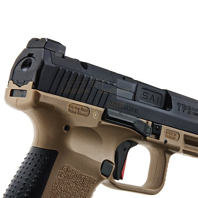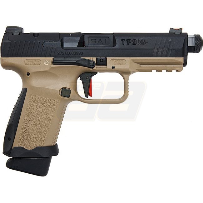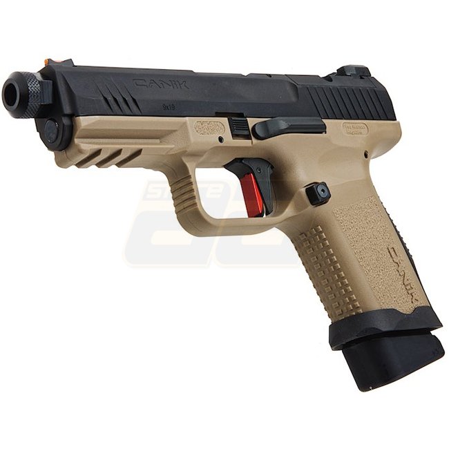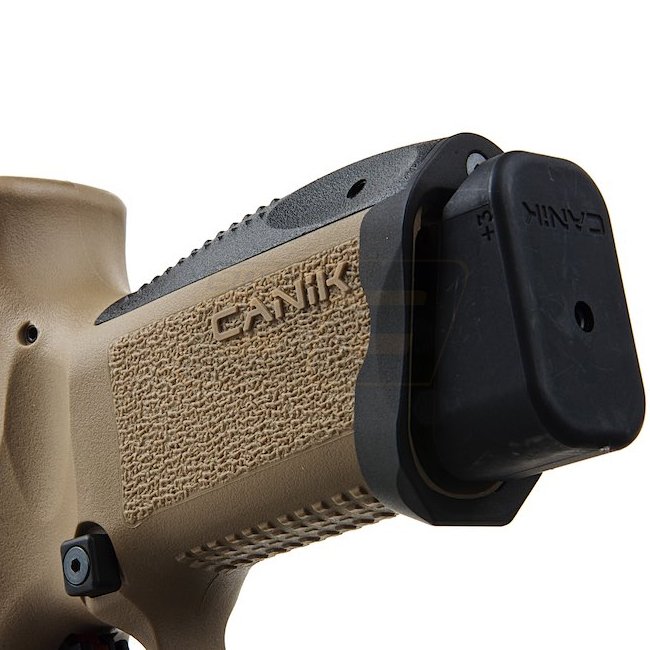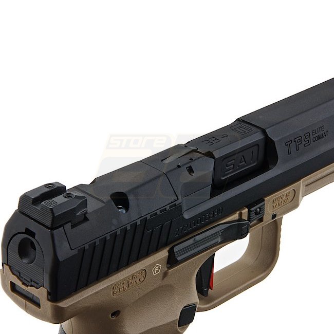 Découvrez une performance de combat d'élite avec le pistolet à gaz WE CANiK x SAI TP9. Glissière en aluminium, poignée en polymère, chargeur de 22 coups, longueur de 193 mm, poids de 850 g, canon intérieur de 110 mm, vitesse de 300-320 FPS, modes semi-aut