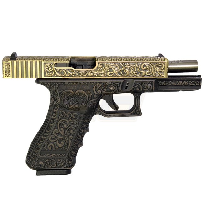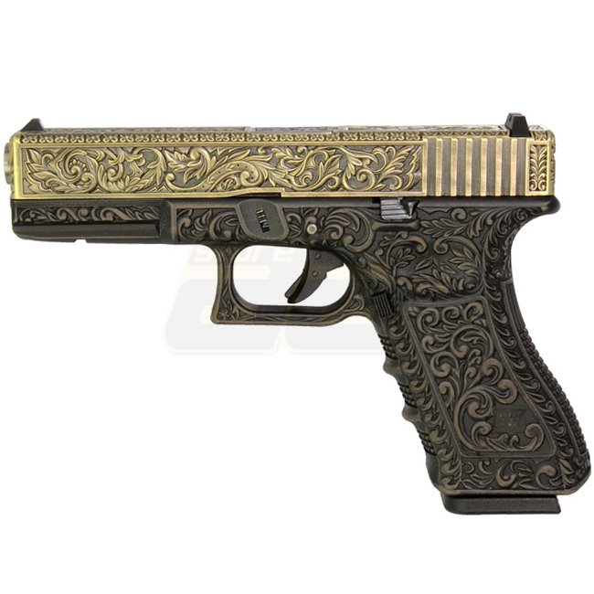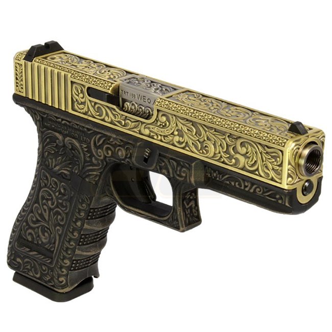 Pistolet à gaz à recul WE G17 avec motif sculpté, fabriqué en métal pour la glissière et en plastique pour la poignée, dispose d'une capacité de chargeur de 22 (6 mm) et d'une longueur de 186 mm. Pesant 770 g, ce pistolet a une longueur de canon interne d