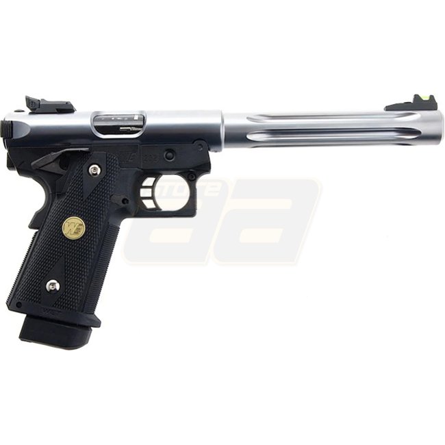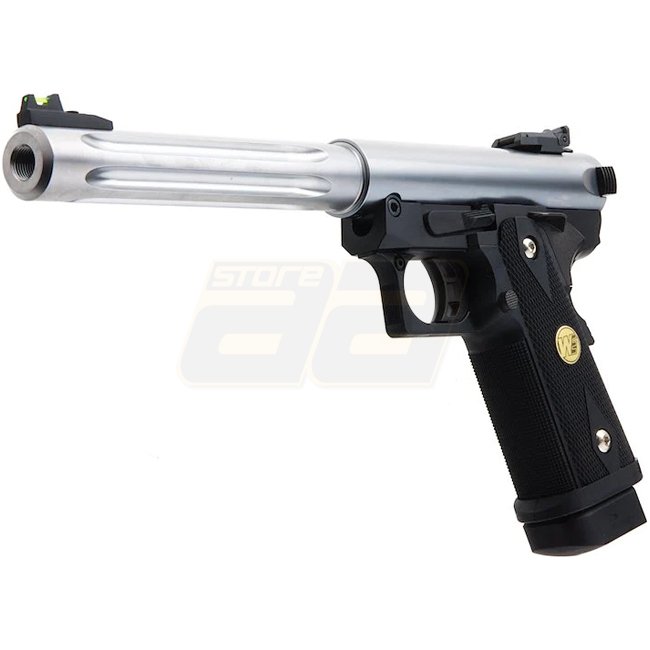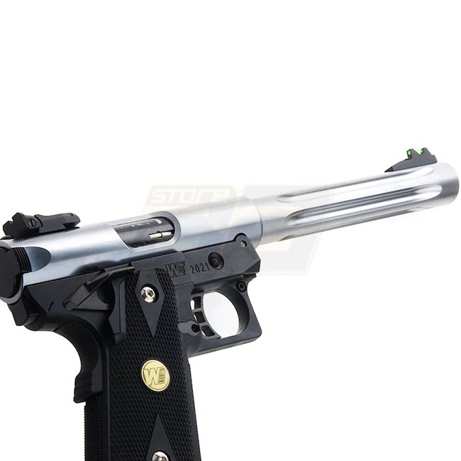 Pistolet à gaz blow back WE Hi-Capa 5.1 Galaxy Premium L, cadre K - Argent. Doté d'une glissière en métal et d'une poignée en plastique, ce pistolet offre une capacité de chargeur de 30 cartouches (6mm). L'arme a une longueur de 284 mm et pèse 1080 g,