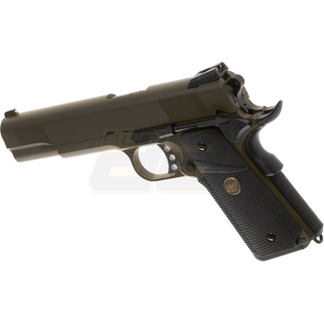 Pistolet à gaz à recul WE M1911 MEU - Olive : Métal/Polymer, capacité de 15 coups, longueur de 220 mm, poids de 1000 g, canon intérieur de 110 mm, 320-340 FPS, semi-automatique, portée de tir de 43,90-46,65 m, Hop Up réglable. Le paquet comprend le pistol