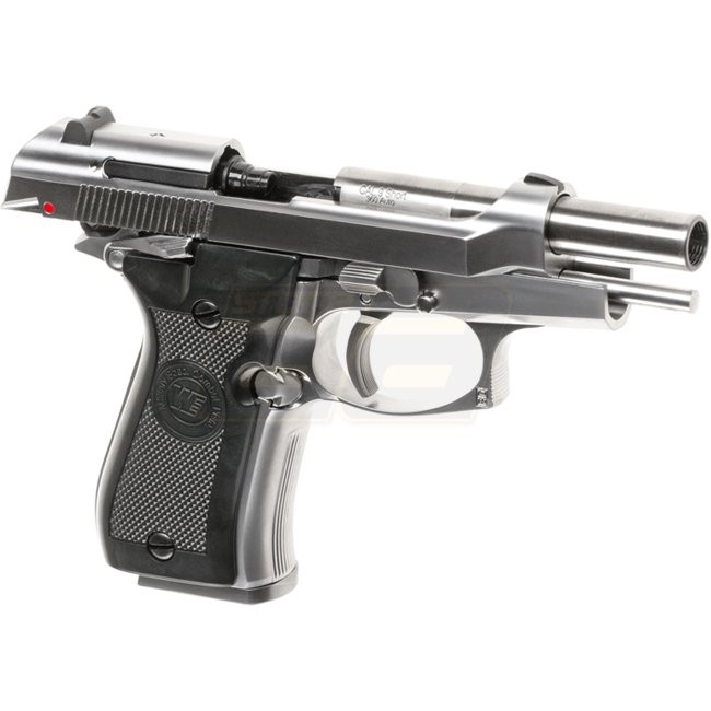 Pistolet à Gaz Blow Back WE M84 - Argent : Métal / Polymère, chargeur de 17 cartouches, longueur de 175mm, poids de 620g, canon interne de 75mm, vitesse de 280-300 FPS, mode Semi Auto, portée de tir de 38,41-41,16m, Hop Up réglable. Le paquet comprend le