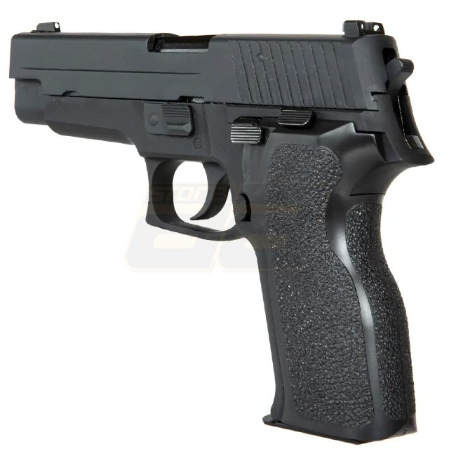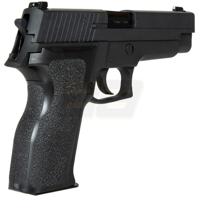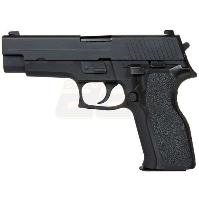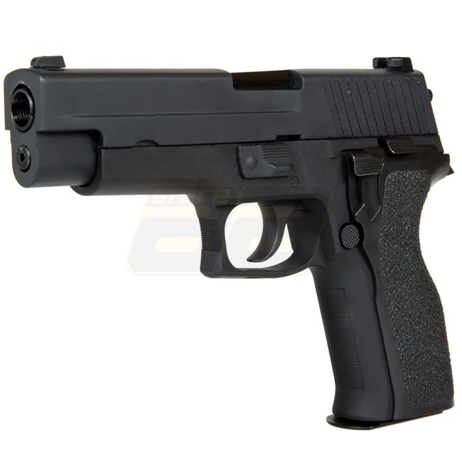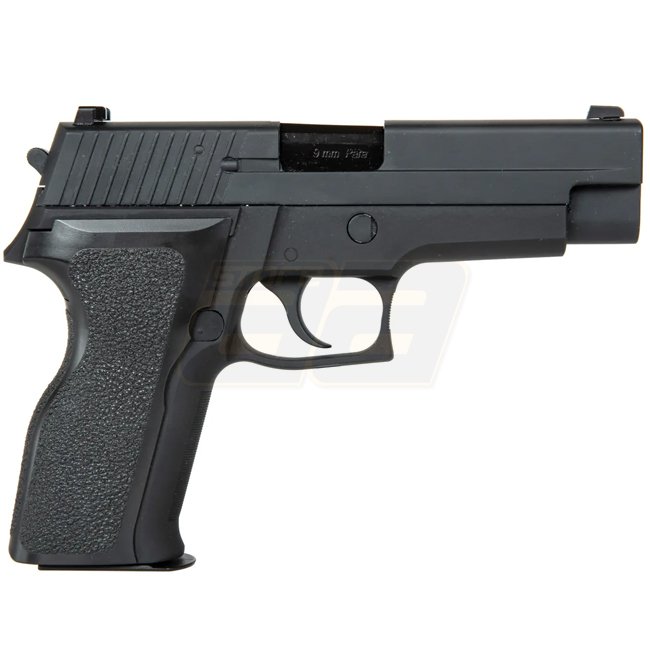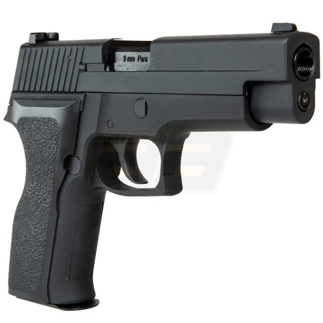 Pistolet à gaz soufflant WE P226 E2 de haute qualité de couleur noire. Construction en métal avec une couverture en plastique pour la poignée, mode de tir semi-automatique, hop-up réglable et une portée de tir de 38,41 à 41,16 m. Le paquet inclut le pisto