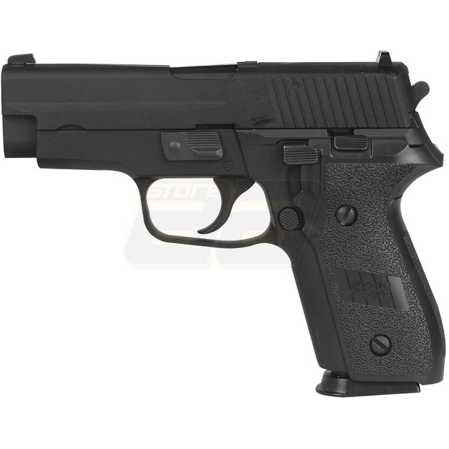Pistolet à gaz à souffler P228 en couleur noire. Corps en métal avec une couverture en plastique pour la poignée. Le chargeur contient 19 billes de 6 mm. Taille compacte de 180 mm et léger à 790 g. Dispose d'un canon interne de 85 mm pour la précision. Ti