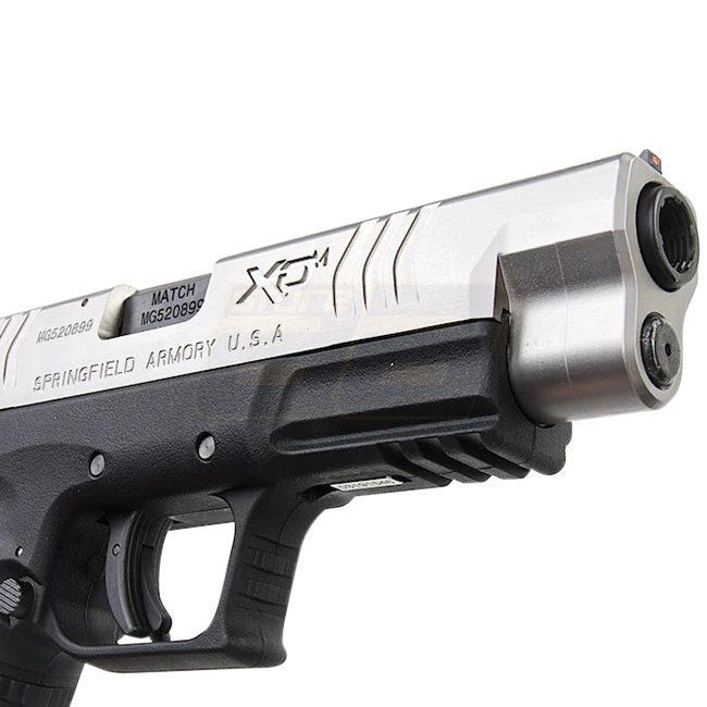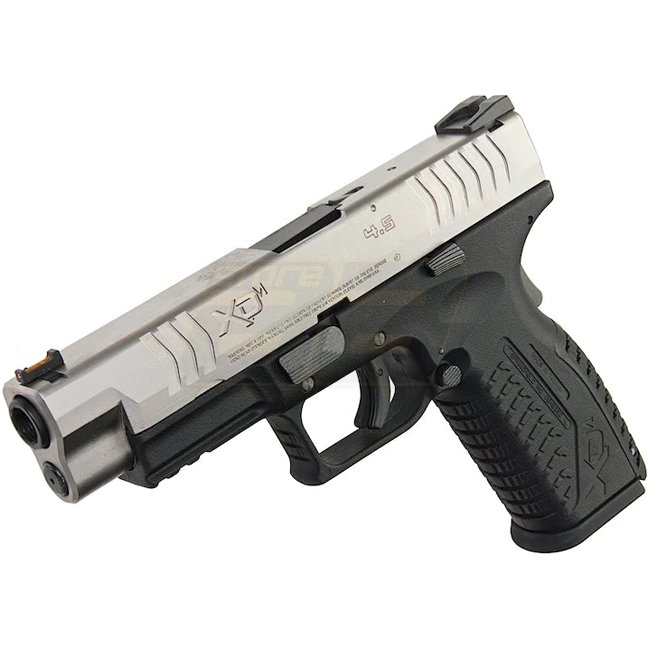 Pistolet WE Springfield Armory XDM 4.5 à gaz avec recul - Argent, fabriqué en Métal / Polycarbonate, avec une capacité de magazine de 25 (6 mm), longueur de 210 mm, poids de 844 g, mode de tir - Semi-Automatique, Hop Up réglable. Le paquet comprend le pis