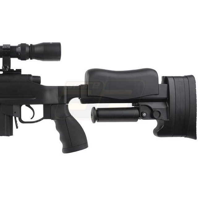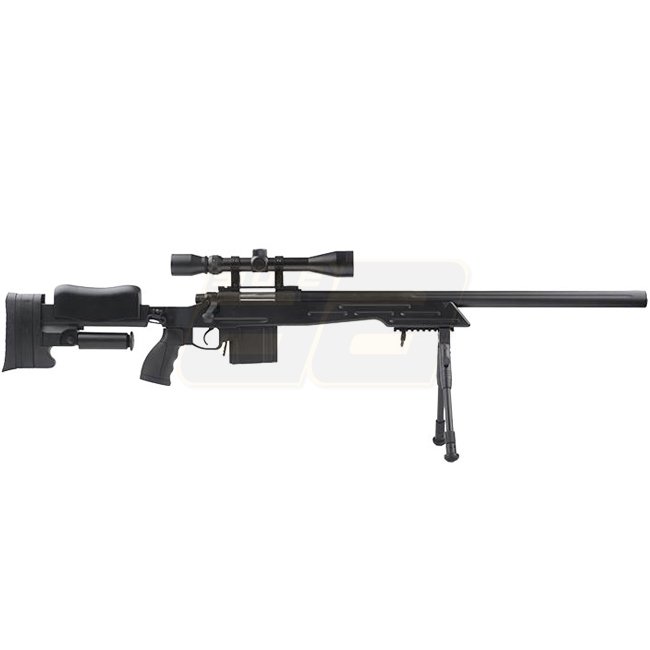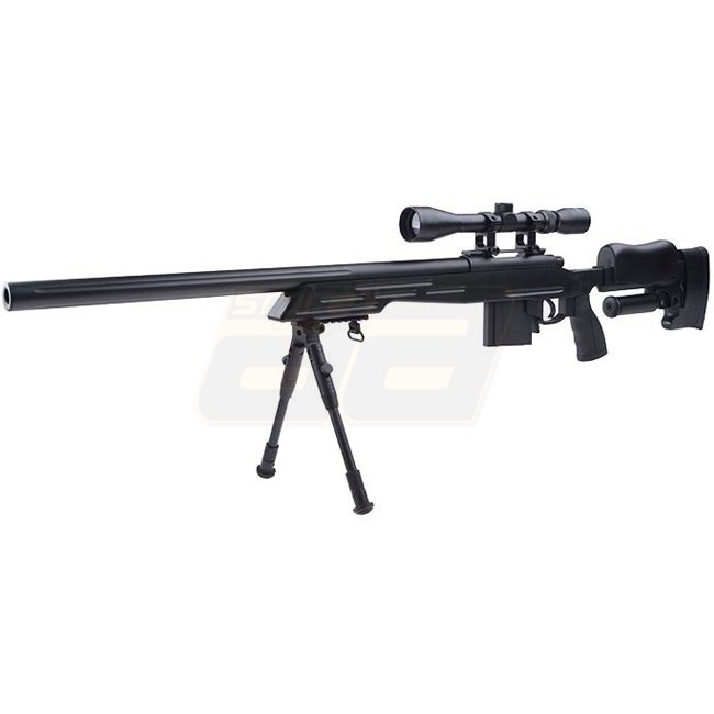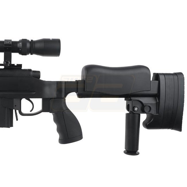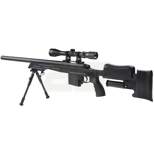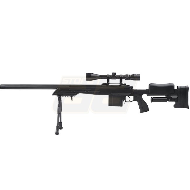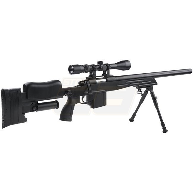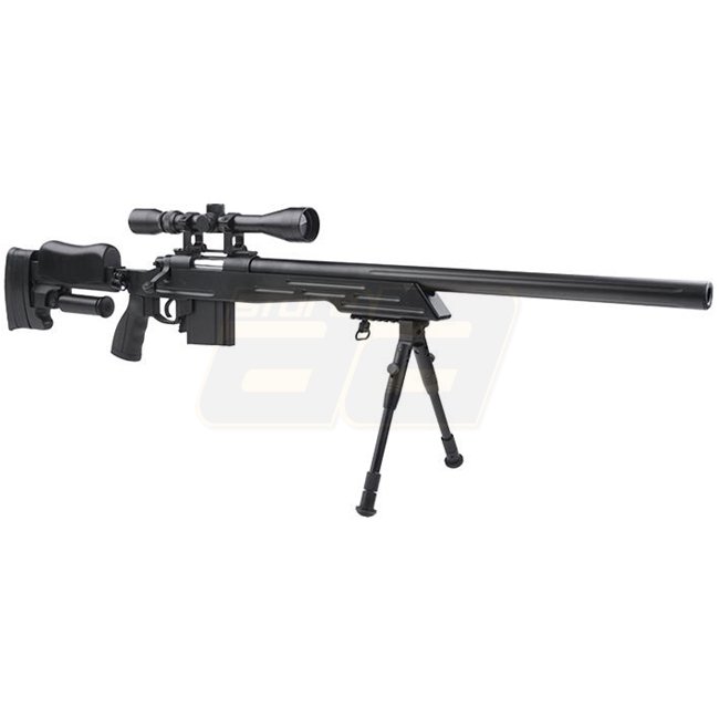 Un fusil de sniper de haute qualité en couleur noire avec système à ressort, construction en métal/polymer, capacité de chargeur de 30 coups, longueur de 1100 mm, poids de 2805 g et longueur de canon intérieur de 600 mm. Présente un filetage de bouche spé