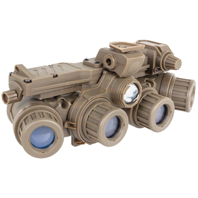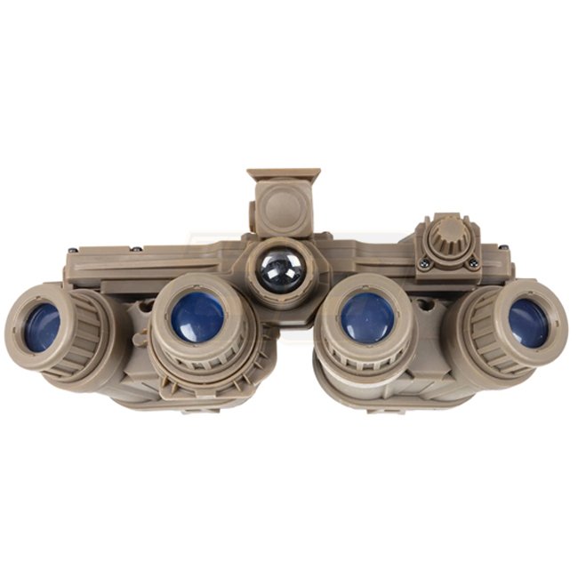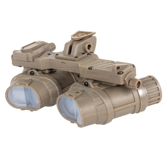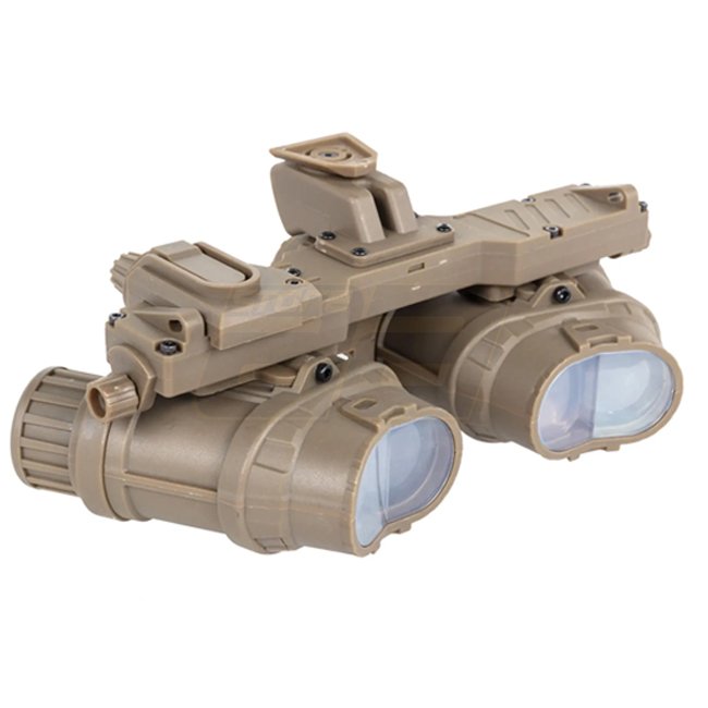Les lunettes de vision nocturne factices GPNVG18 de Wosport sont un modèle non fonctionnel, adapté aux jeux tactiques, accessoires de film ou pour présentation. Un adaptateur permet la fixation au casque, les lunettes offrent une large plage de réglage horizontal. Inclus : un boîtier de batterie factice et câblage ; le boîtier se fixe solidement au casque par Velcro.