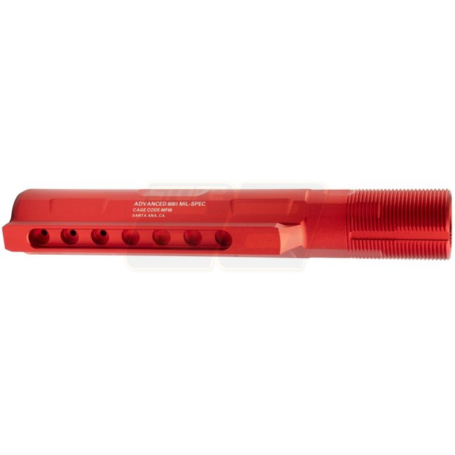 G&P Strike Industries Marui MWS GBBR Buffer Tube Set - Red: Mil-spec buffer tube with SI-style markings. Fits Tokyo Marui MWS GBBR platform. Includes castle nut and end plate.