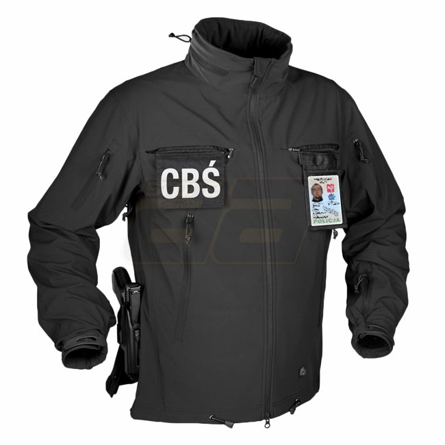 The Helikon-Tex Cougar Shark Skin Jacket in Black XS offers advanced performance and functionality with wind and light rain protection. Ideal for law enforcement or military activities, this jacket features a foldable hood, ID panels, and Quick Side Acces