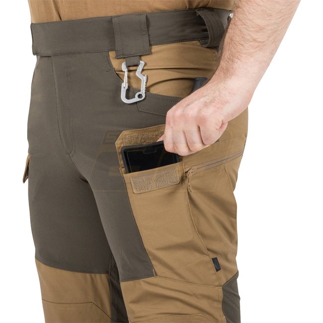 The Helikon-Tex Hybrid Outback Pants are durable and comfortable, offering freedom of movement and waterproofing with wax. Features reinforced pockets, knee reinforcements, and adjustable leg cuffs. Material: 45% Nylon, 29% Cotton, 22% Polyester, 4% Elast