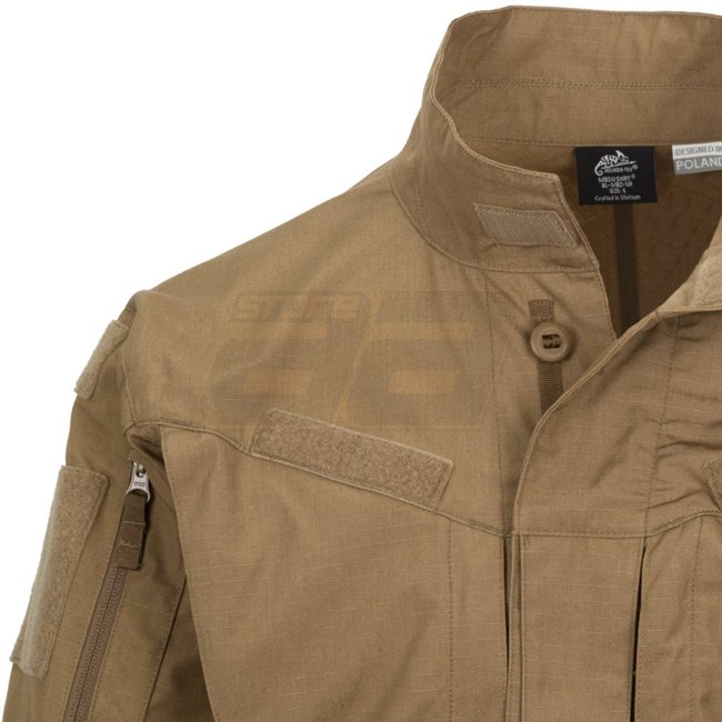 The shirt has profiled fit with side stretchable panels made of VersaStretch fabric. Classic collar can be easily transformed into a stand-up collar, and closed with hook & loop tape. On the chest there are two zippered pockets as well as loop panels for patches above them. Additionally, in the center part there is a rank tab. Mesh panels in arm pits will provide enhanced breathability. On the upper arms there are zippered pockets with loops inside. Large loop panels for patches as well as smaller ones above them for flags or IFF patches.