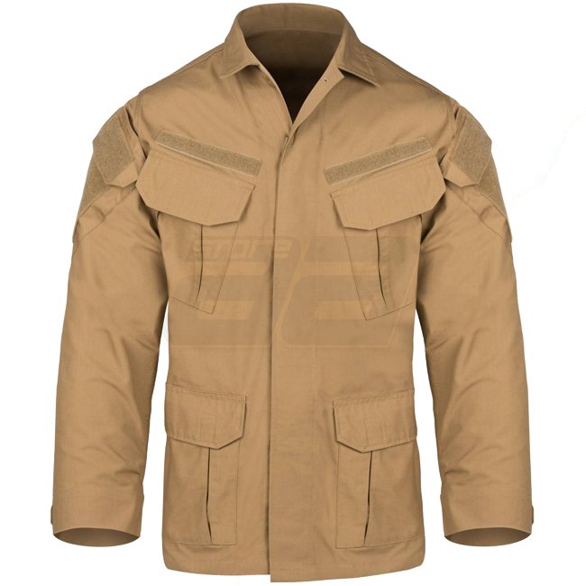 Helikon-Tex Special Forces Uniform NEXT Shirt in Coyote color and XS size. Classic cut with modern solutions including multiple pockets with velcro closures for dirt and water protection, hidden buttons, and reinforced elbows with protective pad pockets.