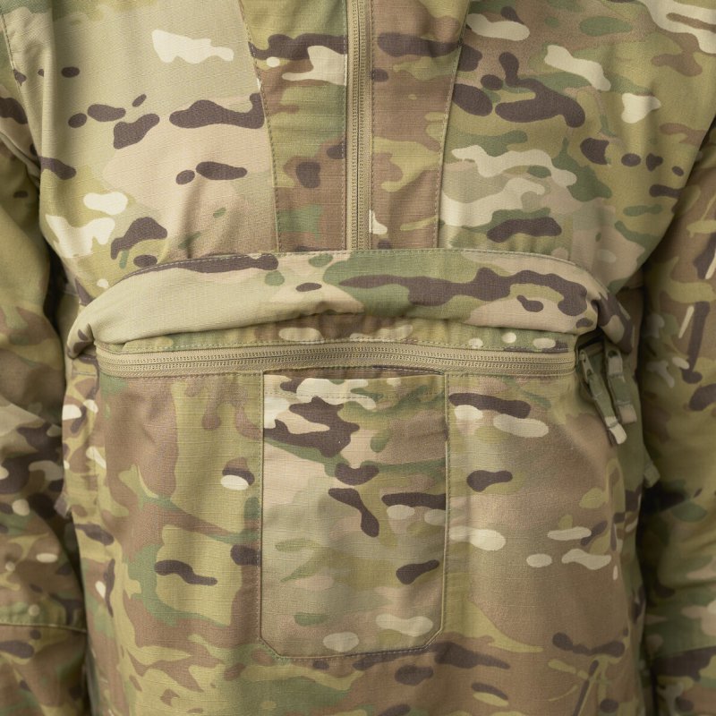 The Helikon-Tex Tracer Anorak Jacket in Multicam is designed for military use, featuring full-length side zippers for adjustable ventilation and a universal unisex loose fit. It serves as a replacement for combat shirts and uniforms, with thoughtful pocke