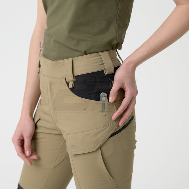The Helikon-Tex Women's OTP Outdoor Tactical Pants in Khaki/Black, size L Long, are made with VersaStretch® fabric for excellent breathability. The four-way stretch material, combined with an ergonomic cut, ensures full freedom of movement and comfort. Th