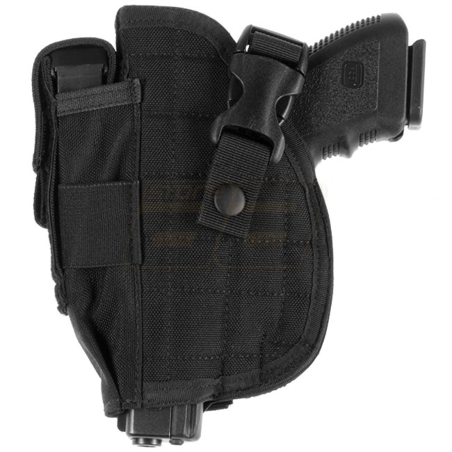 Invader Gear Belt Holster Left - Black. Universal holster for medium size pistols like Glock 17 or Beretta 92 with integrated mag pouch. Secure fastening with adjustable strap, made of durable 600D fabric. Weight: 120g.