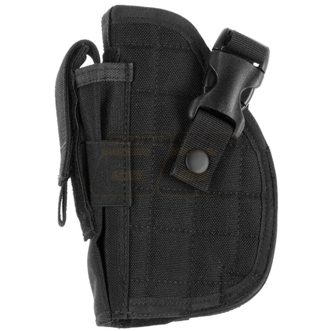 Universal holster designed to fit a wide range of medium size pistols like for example Glock 17 or Beretta 92. It is outfitted with integrated magazine pouch and hook and loop belt closure.