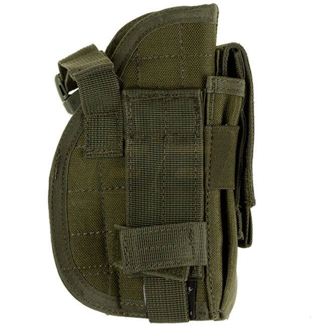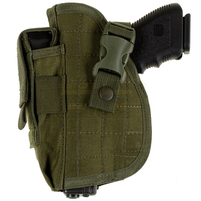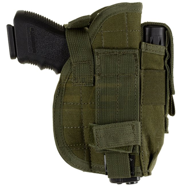 Universal holster designed to fit a wide range of medium size pistols like for example Glock 17 or Beretta 92. It is outfitted with integrated magazine pouch and hook and loop belt closure.