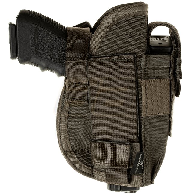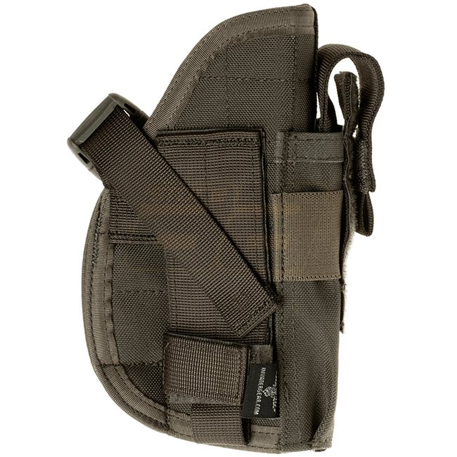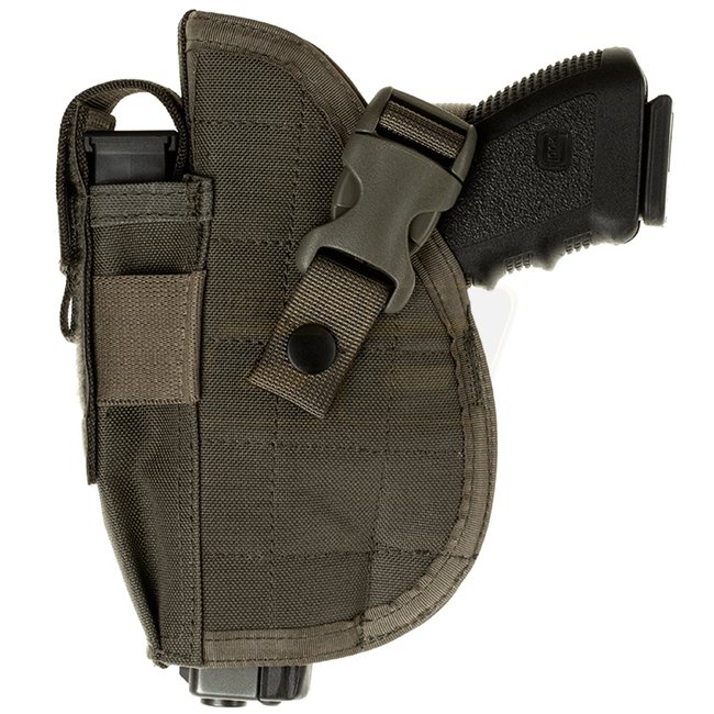 Universal holster designed to fit a wide range of medium size pistols like for example Glock 17 or Beretta 92. It is outfitted with integrated magazine pouch and hook and loop belt closure.