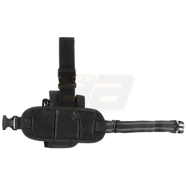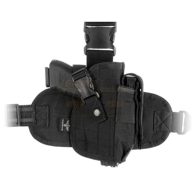 Universal dropleg holster designed to fit a wide range of medium size pistols like for example Glock 17 or Beretta 92. It is outfitted with an integrated magazine pouch and a leg panel which is fastened with a belt clip and three non-slip elastic straps to the thigh.