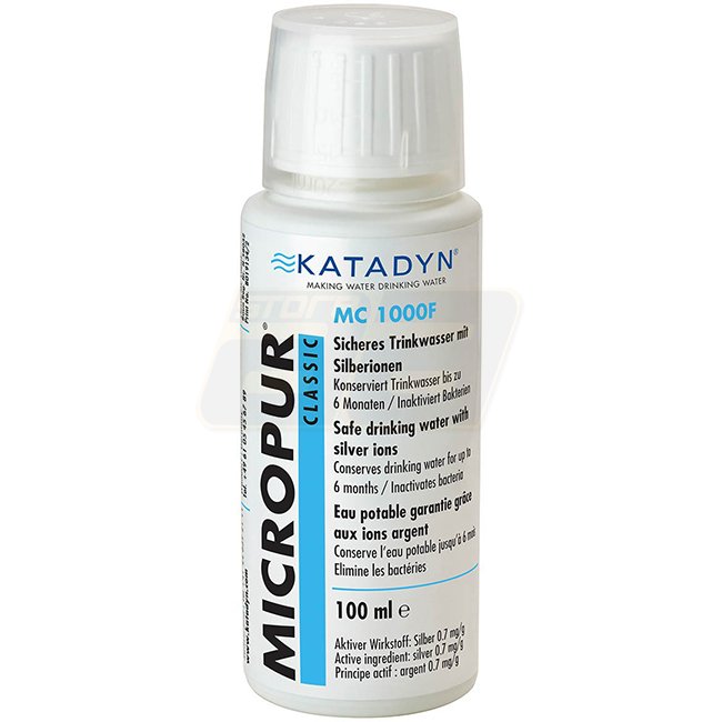 Katadyn Micropur MC 1000F 100 ml is a liquid water purifier that effectively preserves clear drinking water for up to 6 months. This chlorine-free solution is odorless and tasteless, with a reaction time of approximately 2 hours. Just 1 ml treats 10 liter
