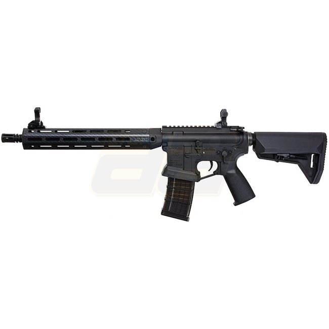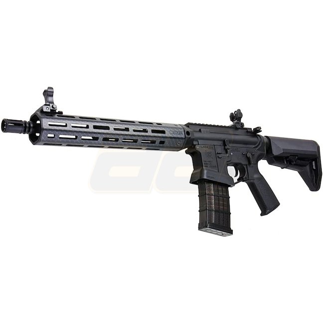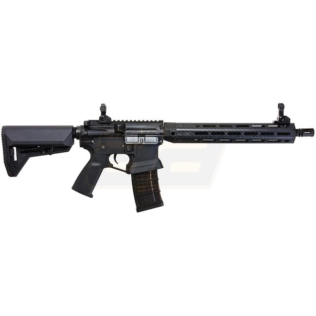 King Arms EMG Lancer Systems L15 Defense AEG featuring Faux Carbon Handguard 12 Inch. Gearbox: Version 2, MOSFET: Yes, Motor: Long Type High Torque Motor. Metal and polymer construction with Magazine capacity of 250(6mm). Length: 780-840mm, Weight: 3086g,