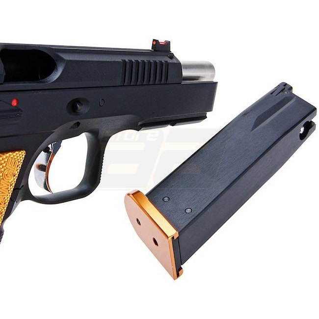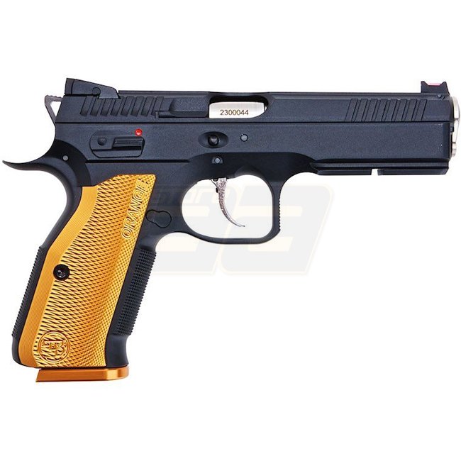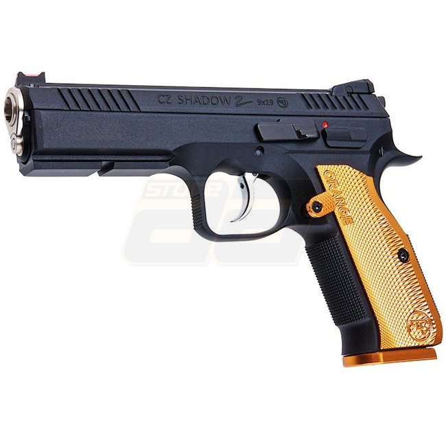 KJ Works CZ Shadow 2 Gas Blow Back Pistol - Orange. Metal, 26rd magazine capacity, 230mm length, 1265g weight, 110mm inner barrel length, 310-330 FPS/0.89-1.01 Joule muzzle velocity, Semi Auto shooting mode, 42.53-45.27m shooting range, Adjustable Hop Up.