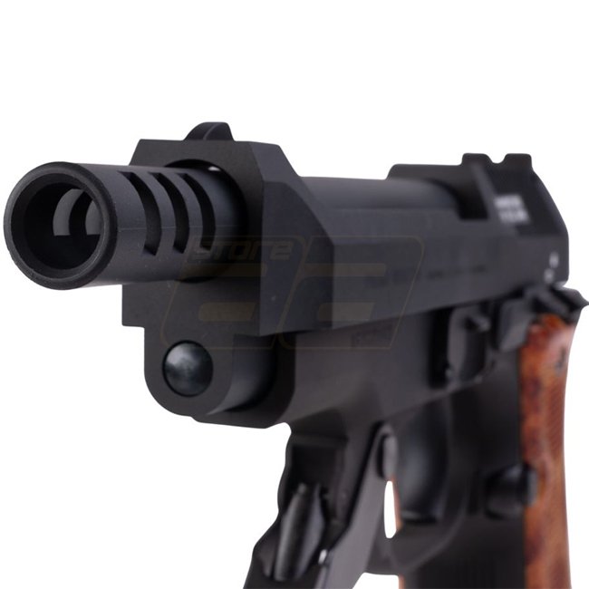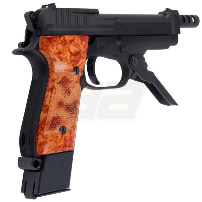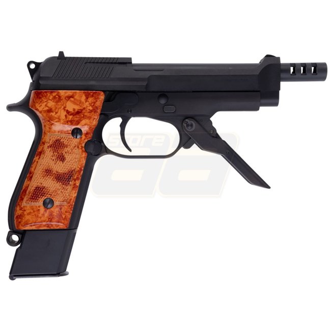 The model features a Heavy Weight (HW) body with metal reinforcements, giving the pistol a realistic weight and high-quality feel. The typical M93R characteristics are fully preserved: three-round burst mode, semi-auto fire, and a foldable front grip for better control during rapid shooting.