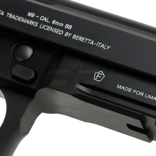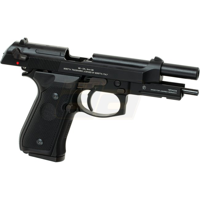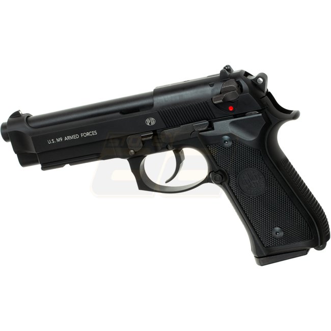 KWA Beretta M9 Gas Blow Back Pistol - Black. Metal/Polymer. 24rd mag. 215mm L, 1100g. 123mm inner barrel. 300-320 FPS. Semi Auto. 41.16-43.90m range. Adjustable Hop Up. Includes Gun & Magazine.