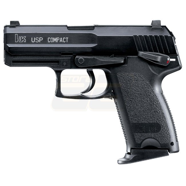 High quality airsoft pistol, KWA H&K USP Compact Full Metal GBB, featuring original Heckler & Koch markings. Metal construction with plastic grip, 21 round magazine capacity, 170mm length, 810g weight, 78mm inner barrel length. Semi Auto shooting mode wit