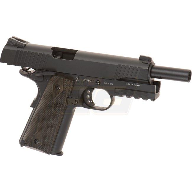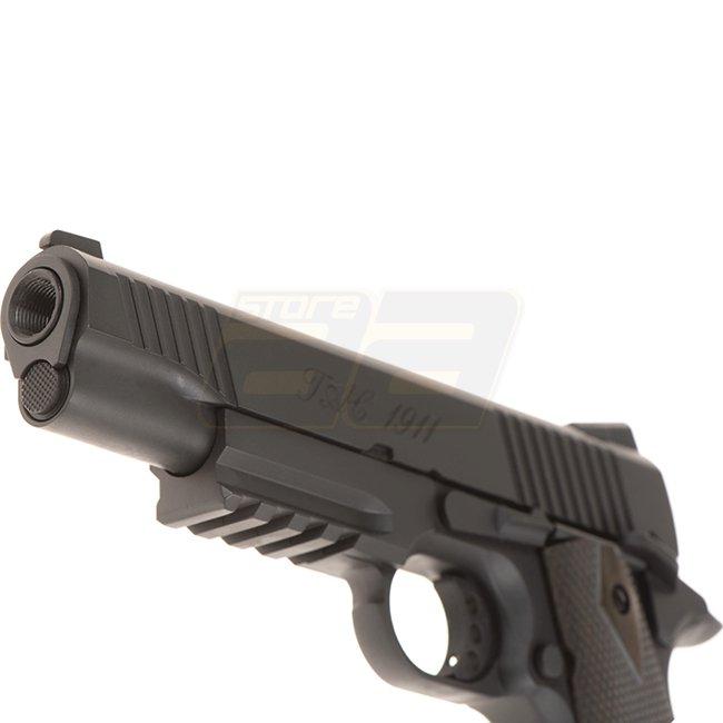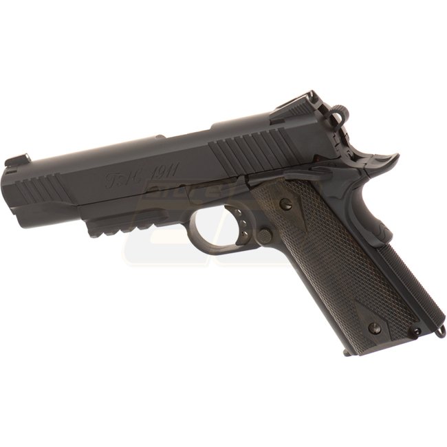 KWC TAC 1911 Co2 Blow Back Pistol - Black: Metal/plastic grip, 16rd mag capacity, 220mm length, 910g weight, 110mm inner barrel, 300-320 FPS velocity, Semi Auto, 41.16-43.90m range, Adjustable Hop Up. Includes gun and magazine.