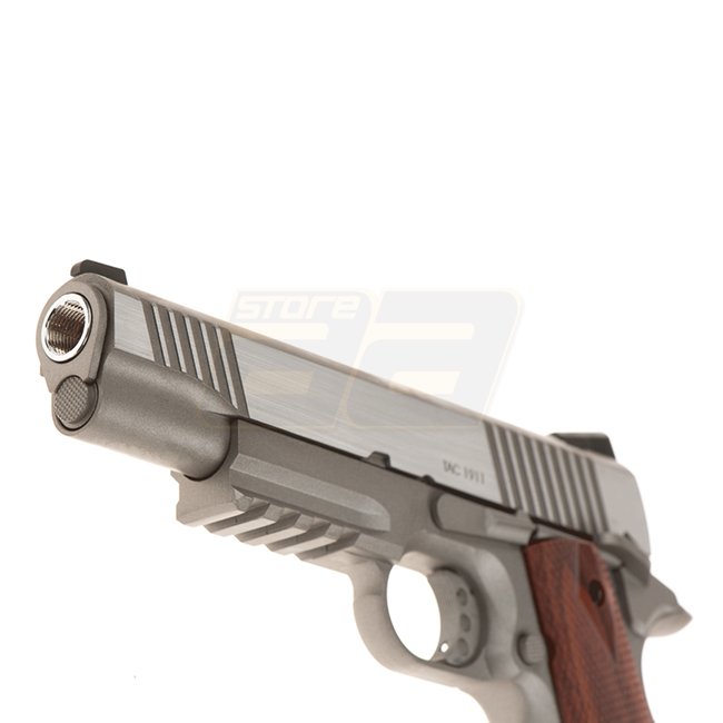 KWC TAC 1911 Co2 Blow Back Pistol - Silver: Metal/plastic grip cover, 16rd magazine, 220mm length, 910g weight, 110mm inner barrel, 300-320 FPS, Semi Auto, Adjustable Hop Up. Includes gun and magazine.