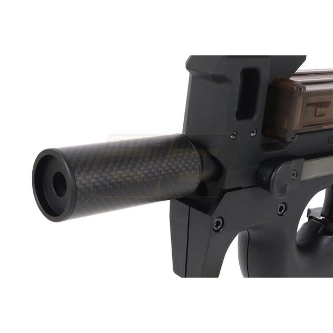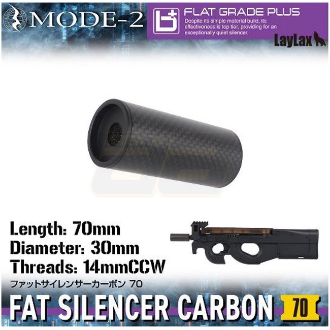 Laylax MODE-2 Carbon Fiber FAT Silencer 14mm CCW 70mm – Black; high-quality silencer designed for airsoft guns, provides enhanced sound suppression without adding significant weight; sleek black finish adds a tactical look to your firearm.