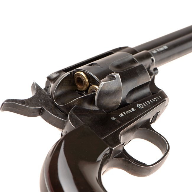 High-quality Legends Western Cowboy Co2 Revolver in classic black color. Metal construction with plastic grip cover, shooting in Semi Auto mode, and a fixed Hop Up feature.