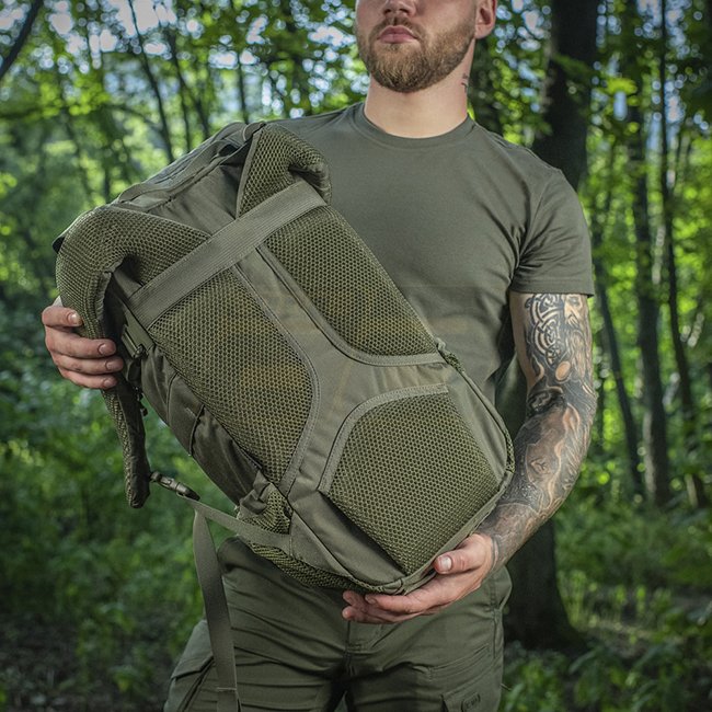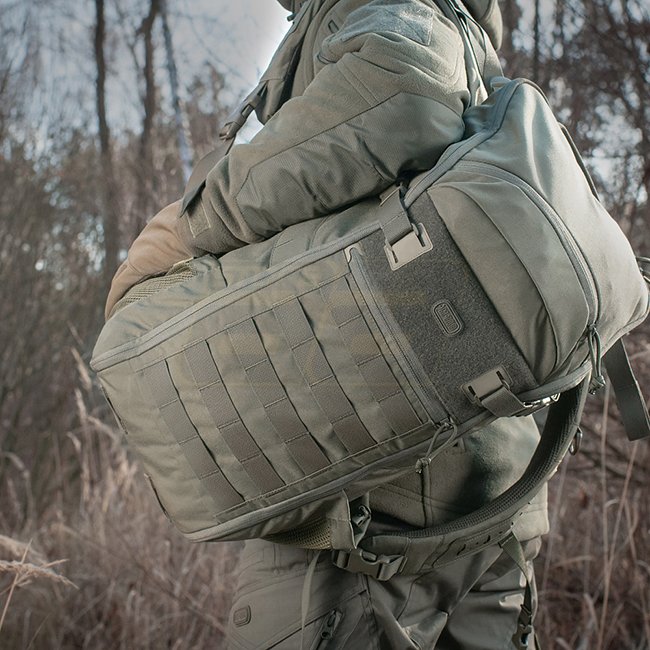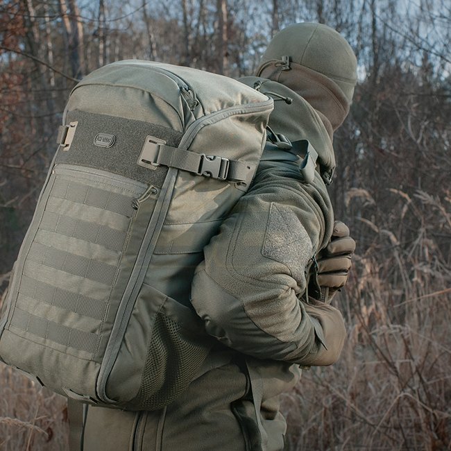 The Elite Small Gen.II backpack opens up like a suitcase for ease of packing. On the sides there are mesh pockets with elastic cord ties, as well as side holders made of elastic straps, covered by flaps. They are designed to better hold the contents of the side pockets. The designers added MOLLE panels on the front surface, as well as strap cells on the bottom of the backpack for installing compression straps.