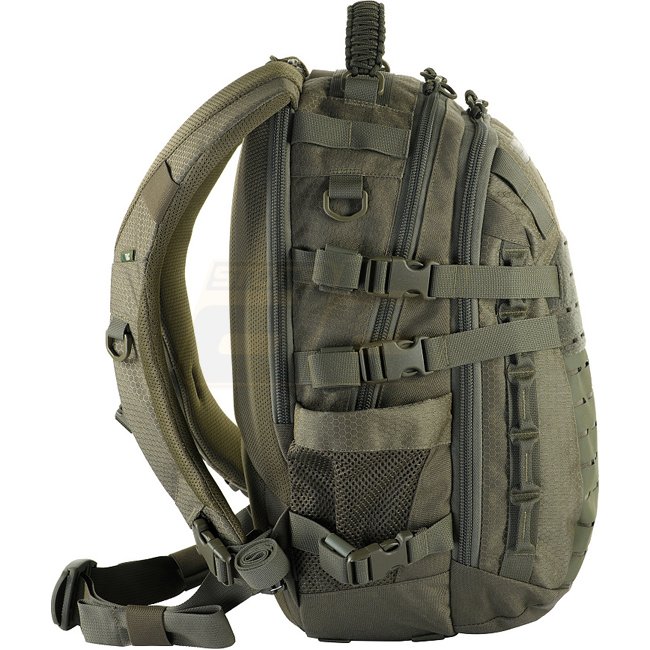 - MOLLE system: The backpack is equipped with a MOLLE laser-cut system that allows you to easily attach additional bags or accessories and customize the backpack to your needs.