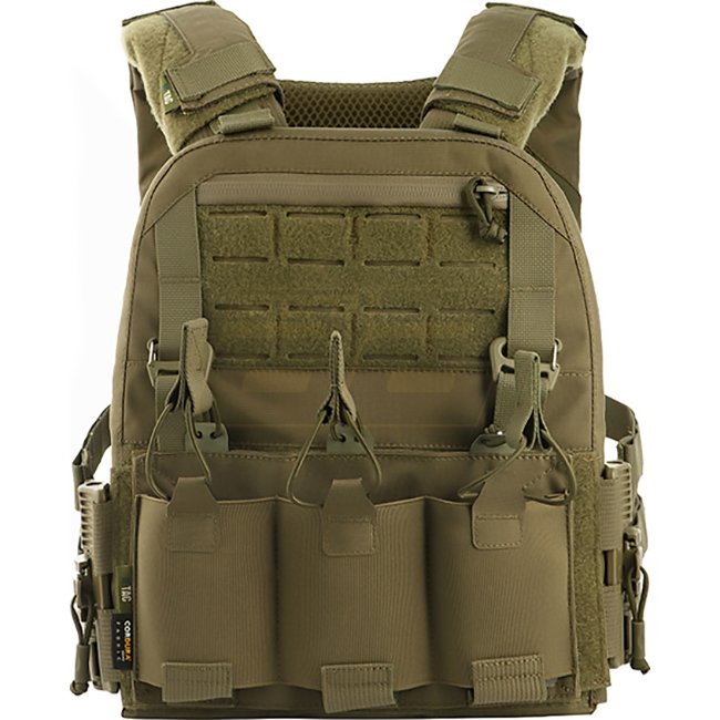 M-Tac Cuirass Plate Carrier QRS in Ranger Green. Features quick release system, modular front pouches, and Cordura construction. Compatible with SAPI & ESAPI size Medium.