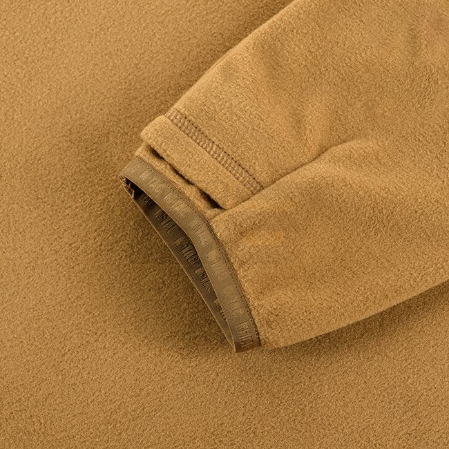 The M-Tac Delta Polartec Fleece Jacket - Coyote - M features thumb holes in the sleeves for warming palms while keeping fingers free. Comfortable, figure-flattering, quick-drying, and perfect for cold weather.