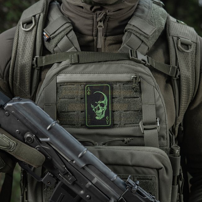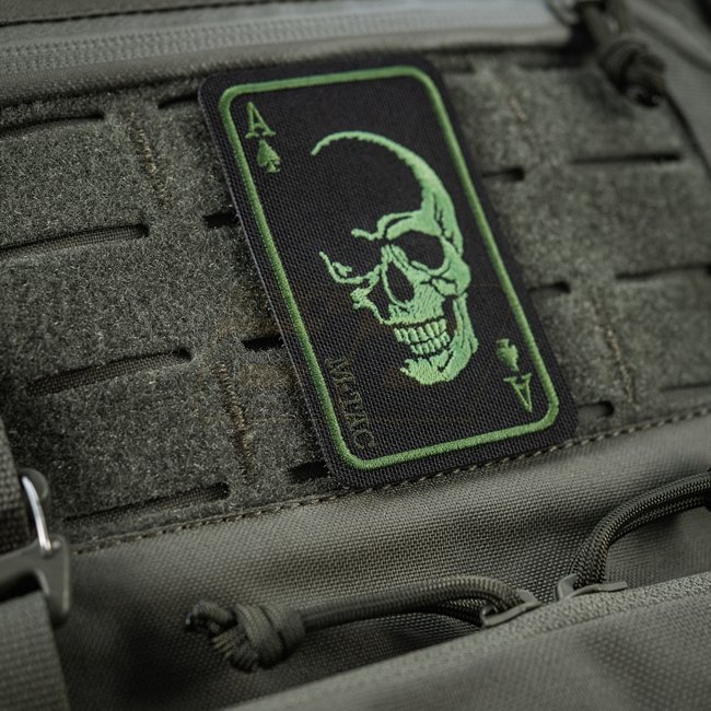 The M-Tac Face of War Embroidery Patch in Olive features an Ace of Spades card design with a skull embroidery, symbolizing fearlessness in danger and victory over death.
