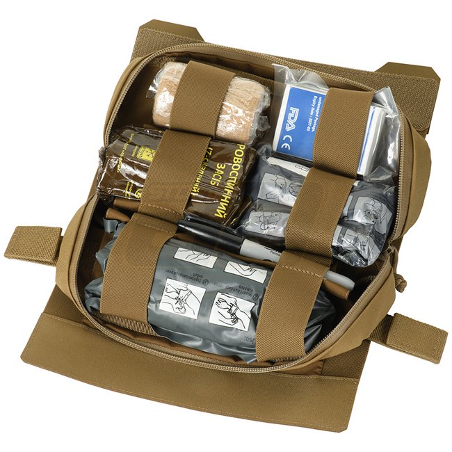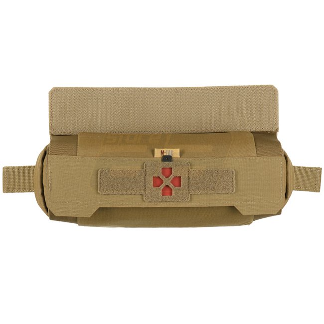 This roll consists of two parts: an outer cover and the internal IFAK (Individual First Aid Kit) pouch. The outer cover is adjustable in volume and provides open two-way access. By pulling the strap it can be quickly removed. The pouch is connected to the cover by means of Velcro to prevent accidental loss. Inside the pouch an organizer made of rubber bands for attaching medical supplies (not included) can be found. The front flap of the pouch is equipped with an identifier in two colors.
