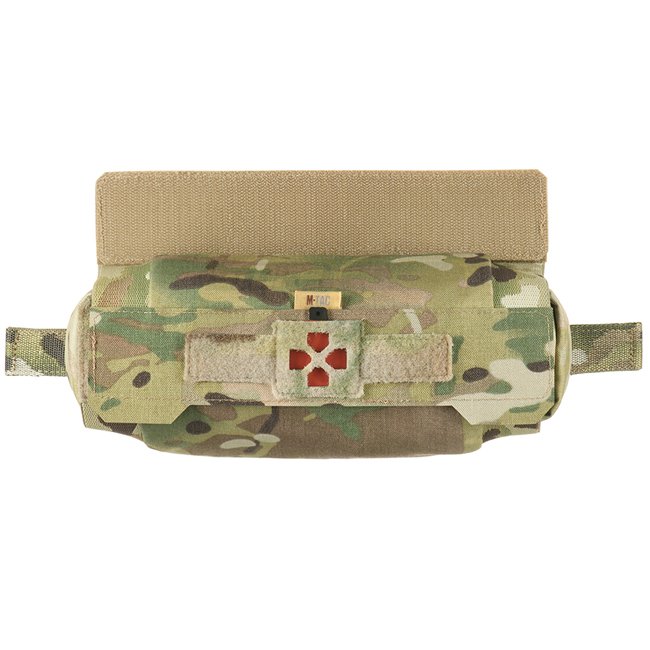 M-Tac Horizontal Medical Pouch ROLL Elite - Multicam. Convenient roll shape takes up minimum space, fits in plate carrier rear pocket. Velcro integration, adjustable volume cover, IFAK pouch with organizer inside. Cordura 500D, 26 x 9 cm.