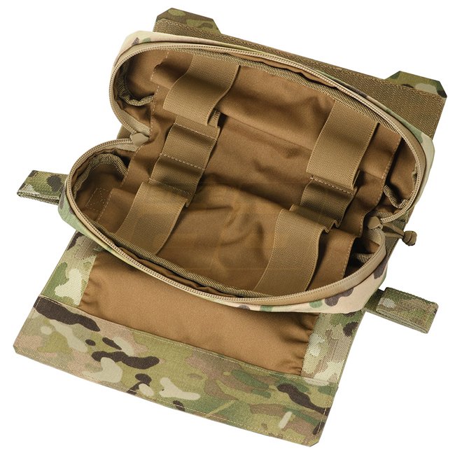 This roll consists of two parts: an outer cover and the internal IFAK (Individual First Aid Kit) pouch. The outer cover is adjustable in volume and provides open two-way access. By pulling the strap it can be quickly removed. The pouch is connected to the cover by means of Velcro to prevent accidental loss. Inside the pouch an organizer made of rubber bands for attaching medical supplies (not included) can be found. The front flap of the pouch is equipped with an identifier in two colors.