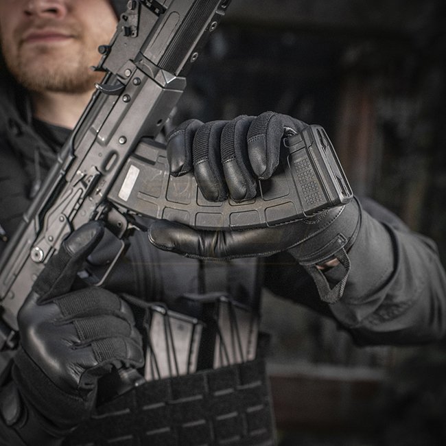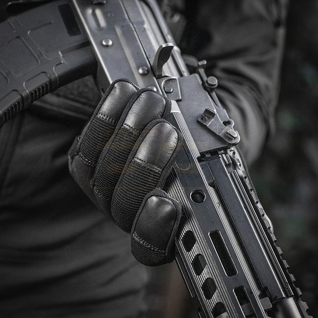 M-Tac Police Gloves Gen.II in black, designed for police forces. Synthetic/leather blend, padded active zones, adjustable Velcro cuff closures for comfort. Material: Polyester/Leather palm.