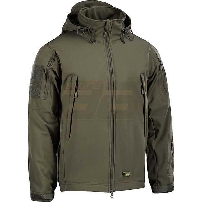 The M-Tac Soft Shell Jacket in Olive, size XS, features an interlayer polyurethane membrane for weather protection. Lightweight and versatile, this jacket combines wind and weather resistance with insulation. Moisture and dirt-deflecting top fabric for co