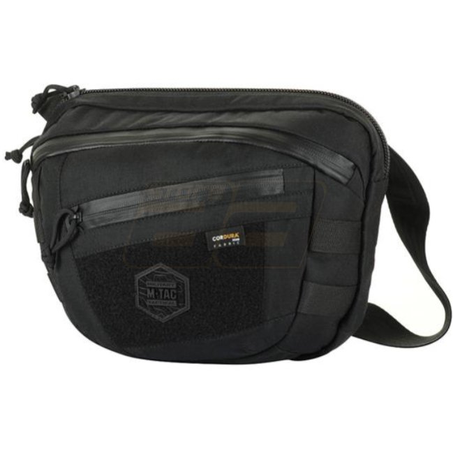 M-Tac Sphaera Hardsling Bag Large Elite Velcro - Black, made of durable Cordura Hex and featuring a combination of Cordura 500D and Cordura 1000D. It weighs only 340g, perfect for carrying essentials with ease.