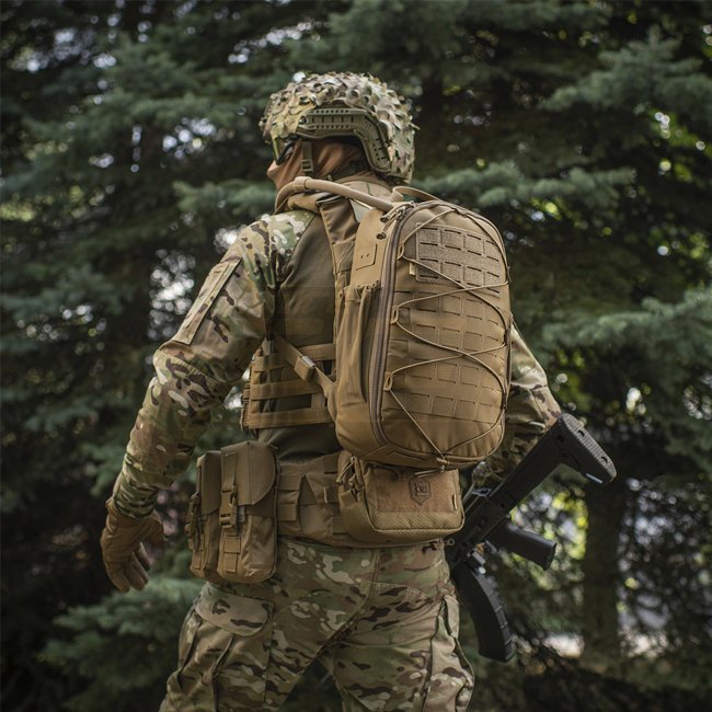 Inside there is a compartment for a hydration system, and on top there is an opening for its tube. On the flap of the backpack there are two mesh pockets, which are suitable for stowing EDC accessories. The front of the backpack is equipped with a MOLLE Laser Cut system, made of Cordura 500D, which allows you to attach additional equipment.