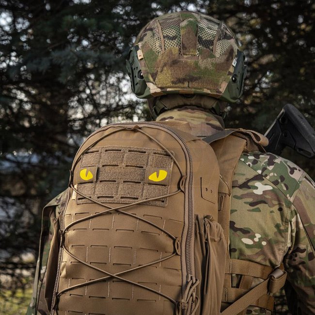 M-Tac Yellow Tiger Eyes Laser Cut Patch - Coyote, made of Cordura 500D at the front and hook surface at the back, measuring 40 x 25 mm.