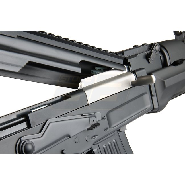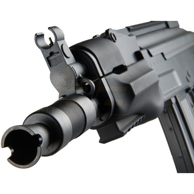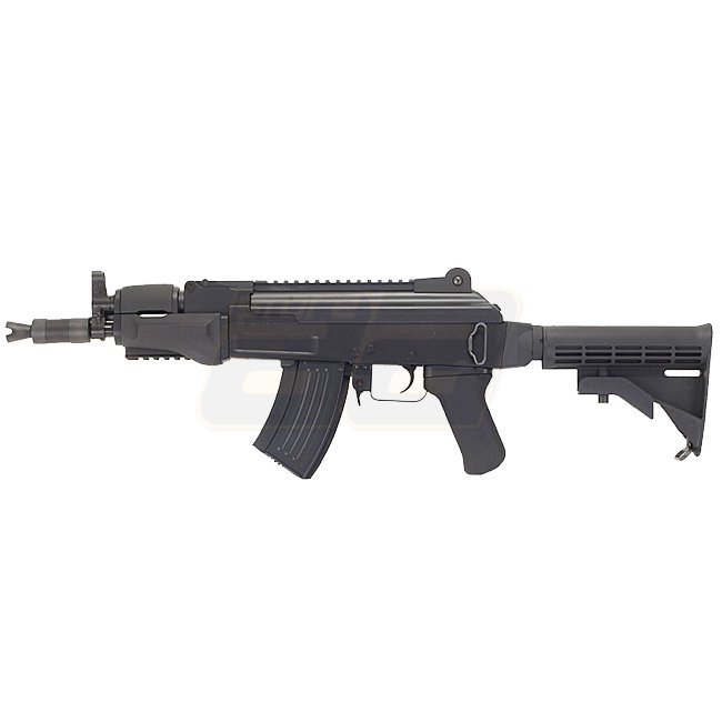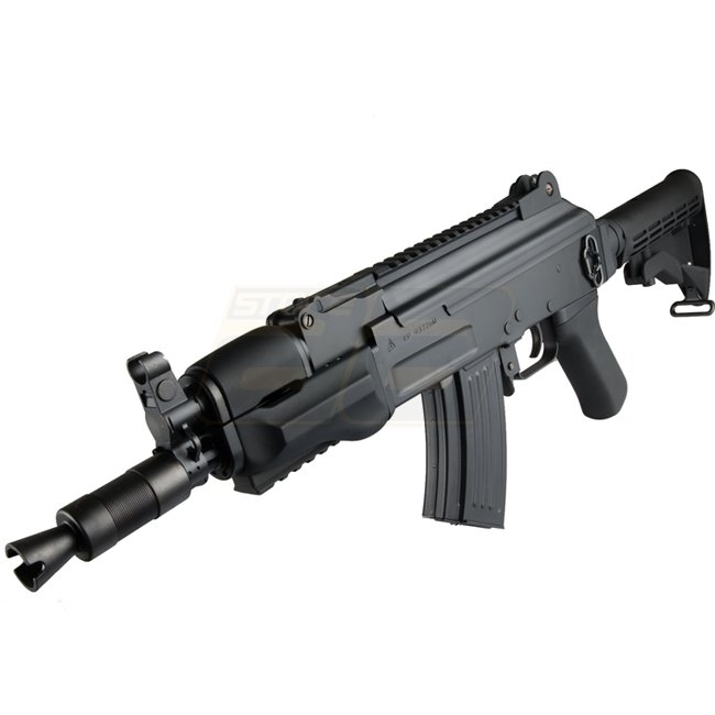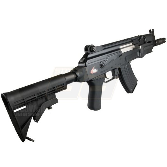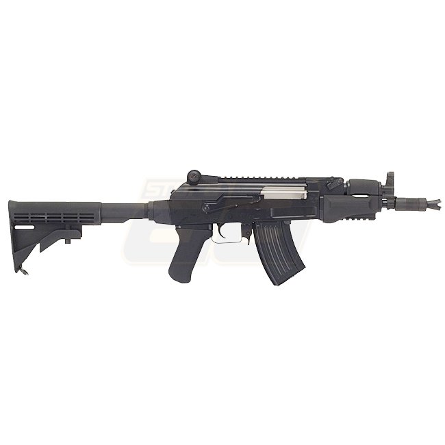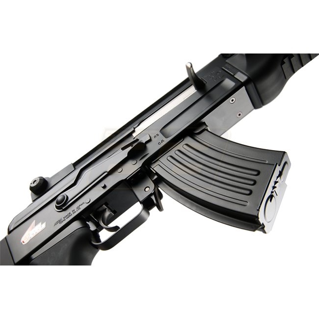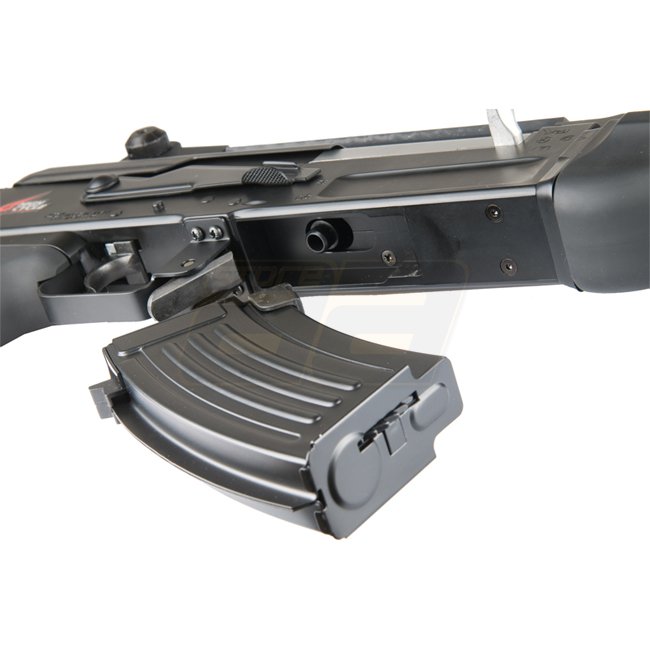 The Marui AK-47 High Cycle AEG features a high rate of fire of 1500 BBs/minute with an 8.4V battery. Gearbox: Version 3, Motor: Short Type (EG-3000 High Cycle), Material: ABS plastic, Magazine capacity: 250 (6mm), Length: 678-760mm, Weight: 2560g. Muzzle
