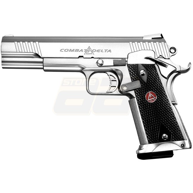 The Marui Combat Delta EBB in Silver is a lightweight airsoft gun with semi-auto shooting mode. Comes with a magazine capacity of 15, ABS plastic material, and a muzzle velocity of 190-210 FPS. Package includes gun, magazine, and manual.