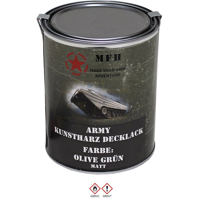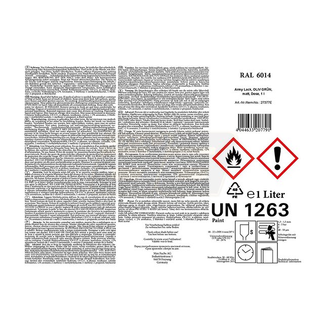 Quick-drying synthetic resin paint durable, for in- and outdoor use high opacity, short drying time high UV- and weather resistance excellent flow, high final hardness temperature resistant, suitable for all surfaces Please observe the safety instructions! RAL6014 Application: spray method - dilute 10 - 20 % coating method - apply undiluted dilution: UNIVERSAL THINNER (UN or UN 21 dilution 10 - 20 %) cleaning: clean tools with a NITROWASH DILUTION drying time: dust-dry ca. 30 - 60 min, grip-dry ca. 6 - 8 h, assembly-safe ca. 24 h Maximum order quantity per shipment = 22 cans
