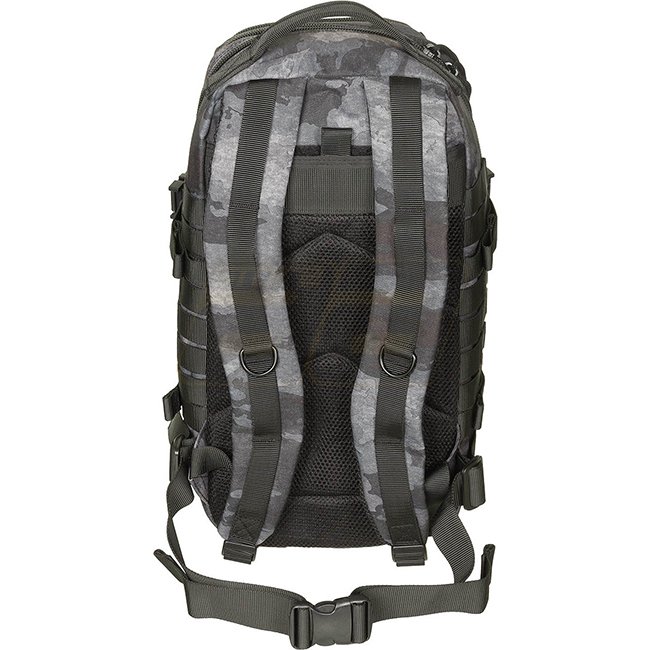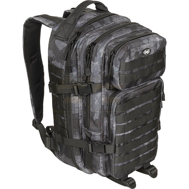 MFH Backpack Assault 1 - HDT Camo LE - Durable camo backpack with adjustable straps, various compartments, hydration pack slot, and Molle attachment loops. Capacity: 30l. Dimensions: 23 x 44 x 24 cm (W x H x D).