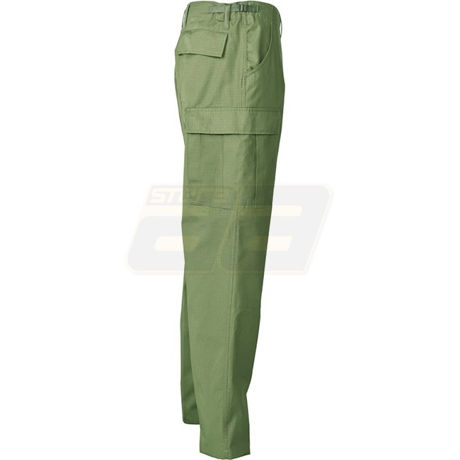 MFH BDU Combat Pants Ripstop in Olive is a classic US ARMY pants featuring rip stop material, button fly, multiple pockets, adjustable waistband, reinforced knees and seat, and bottom hem adjustability. Made of 100% Cotton.